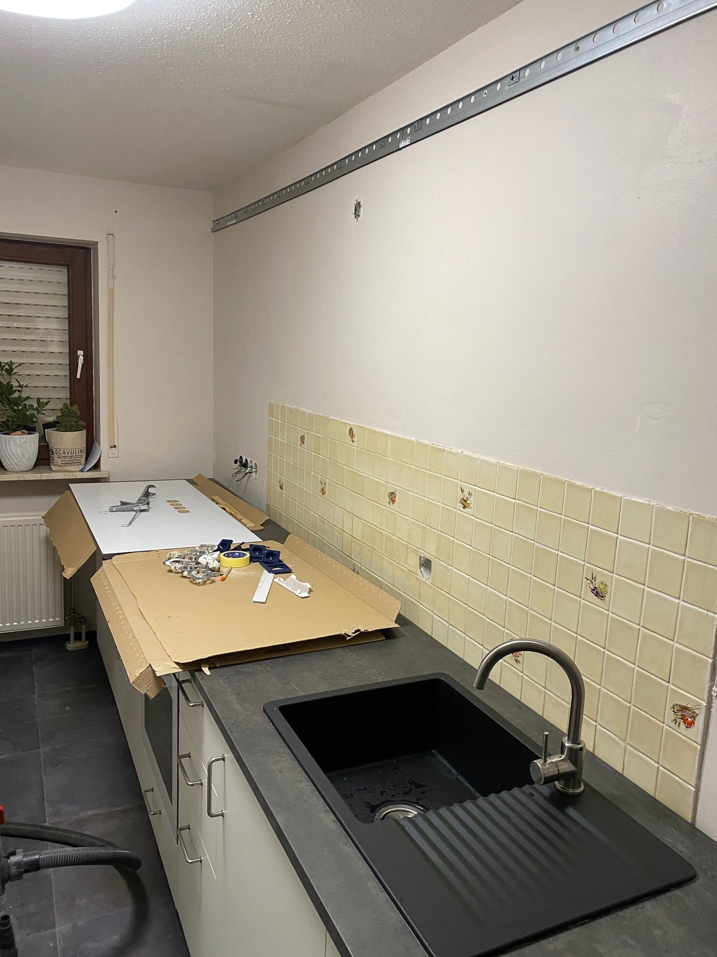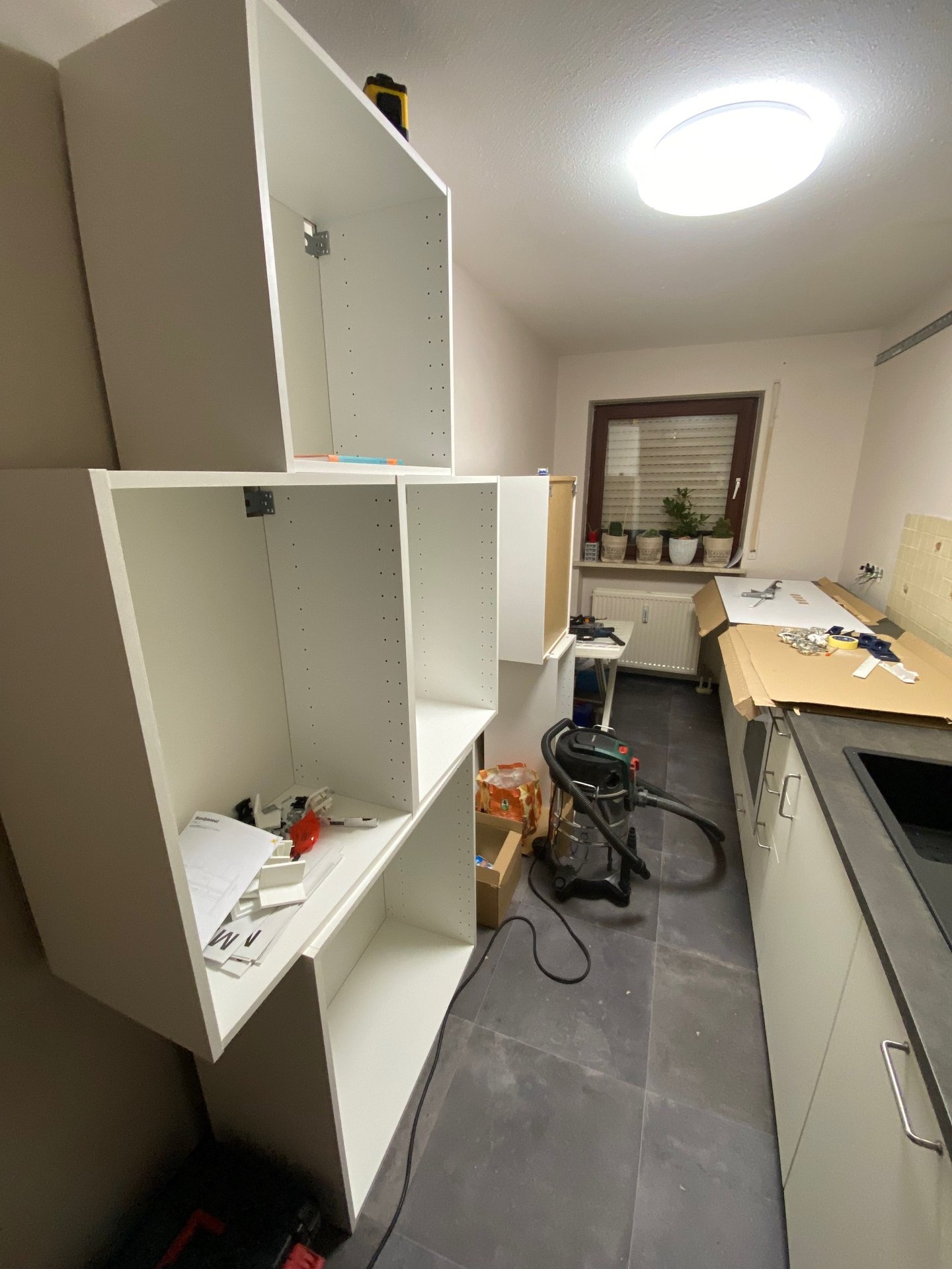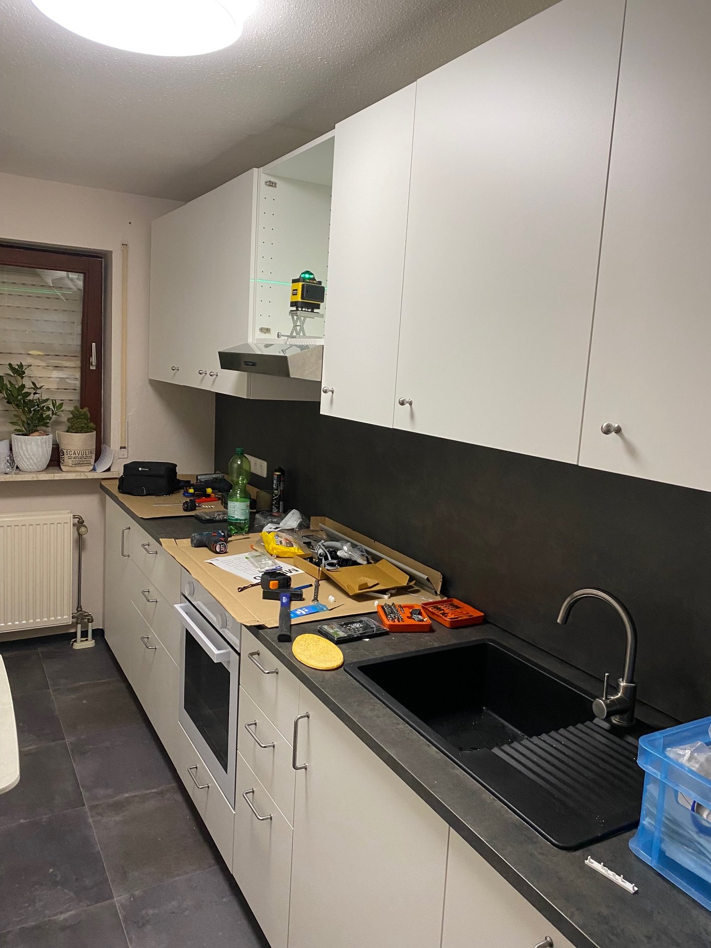 Montage und Einbau der oberen Regale der neuen Küche, Dunstabzugshaube, Anbringung der Dekorplatte an der Wand und der Dekorregale an den Wänden