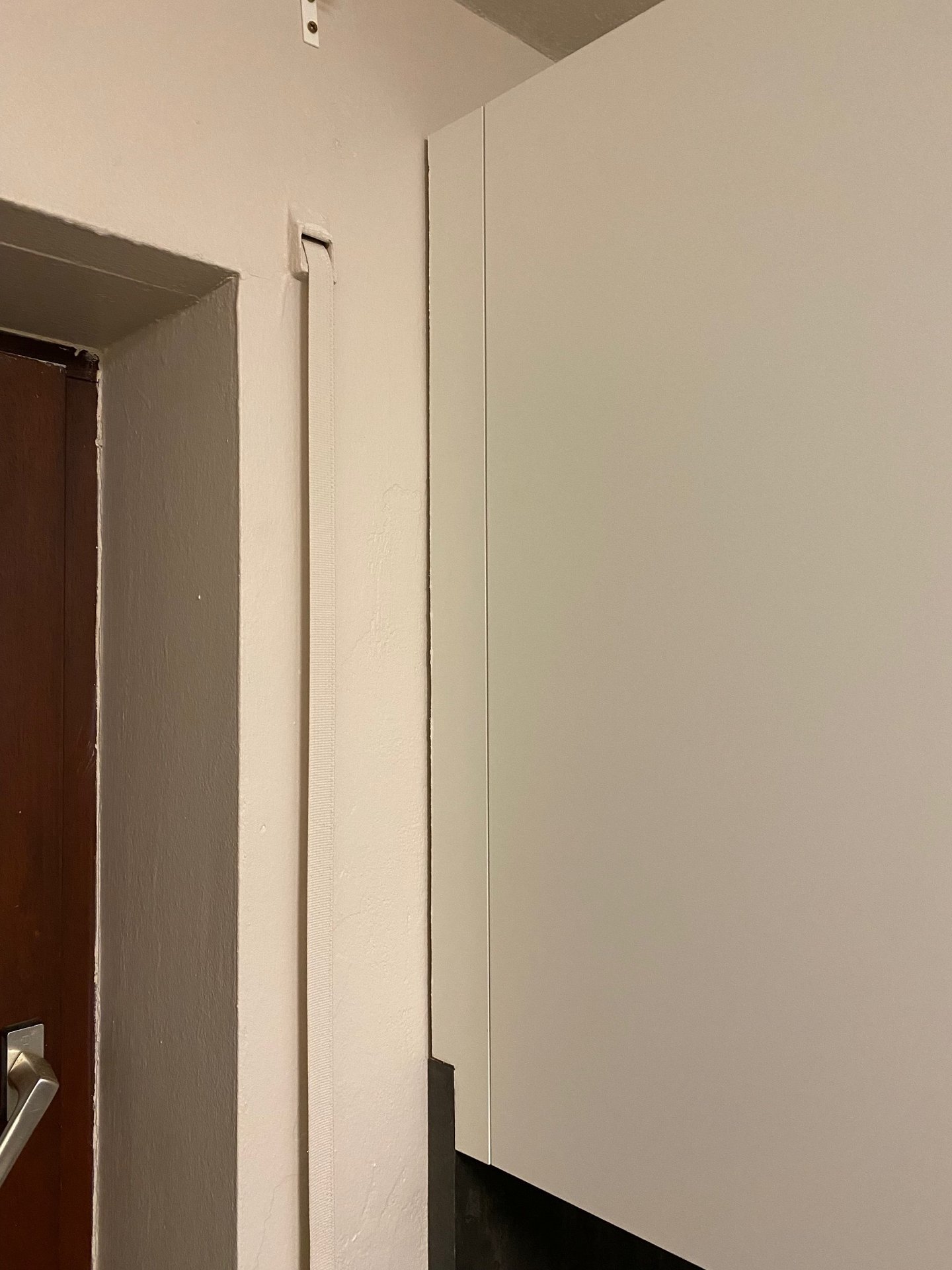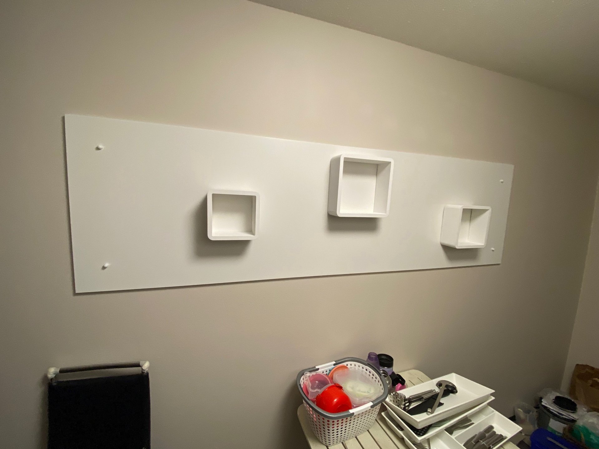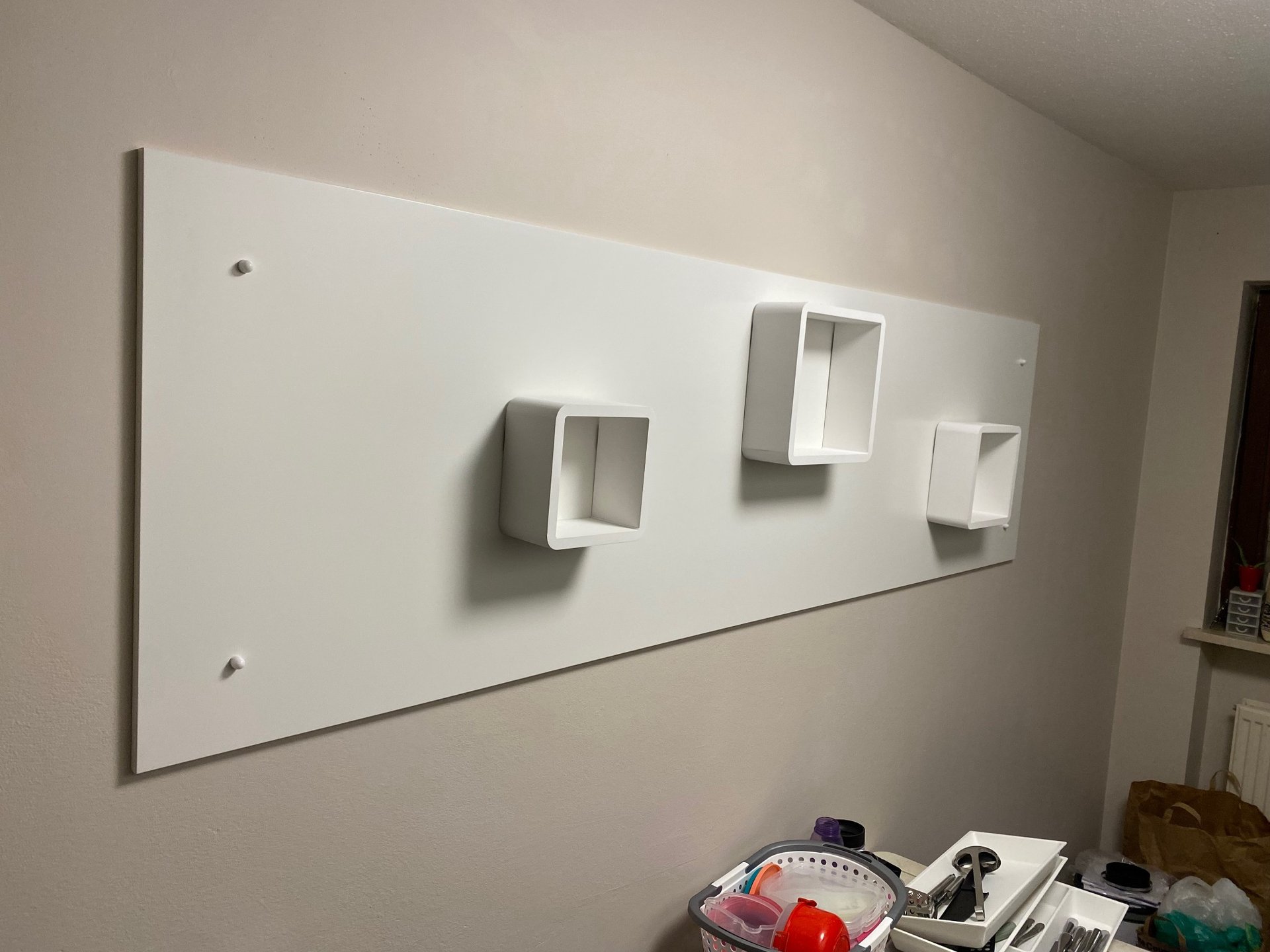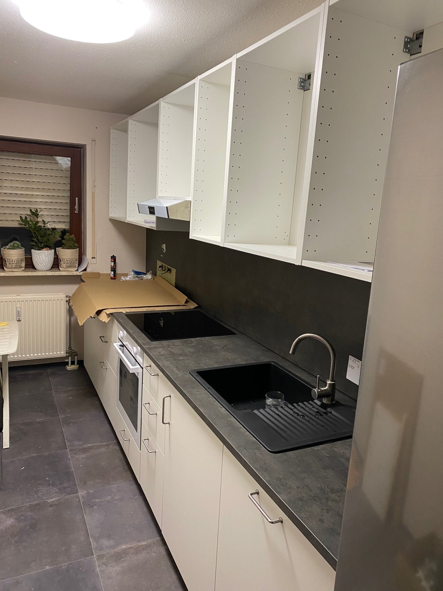 Montage und Einbau der oberen Regale der neuen Küche, Dunstabzugshaube, Anbringung der Dekorplatte an der Wand und der Dekorregale an den Wänden