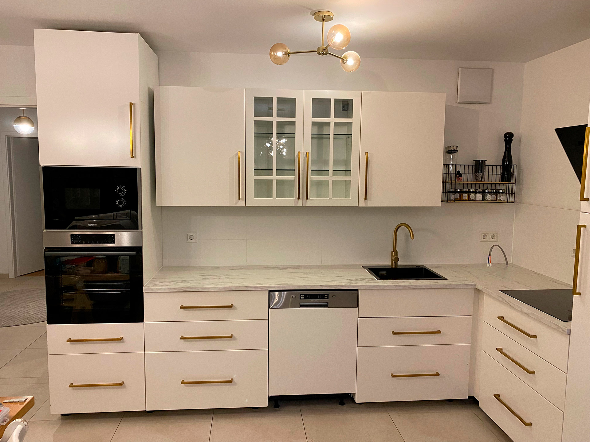Austausch von Eckküchenarbeitsplatten, Einbau von Spüle und Kochfeld, Anpassung aller Türen