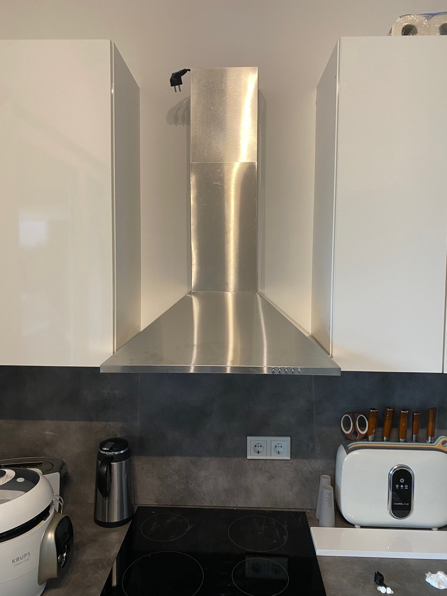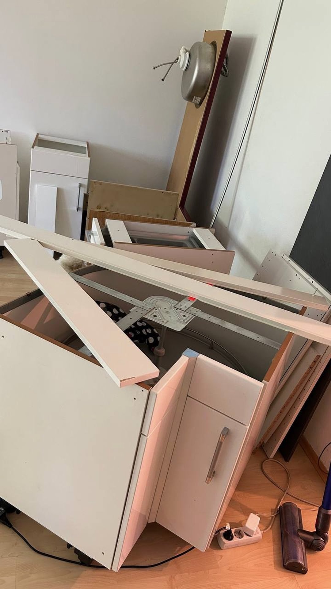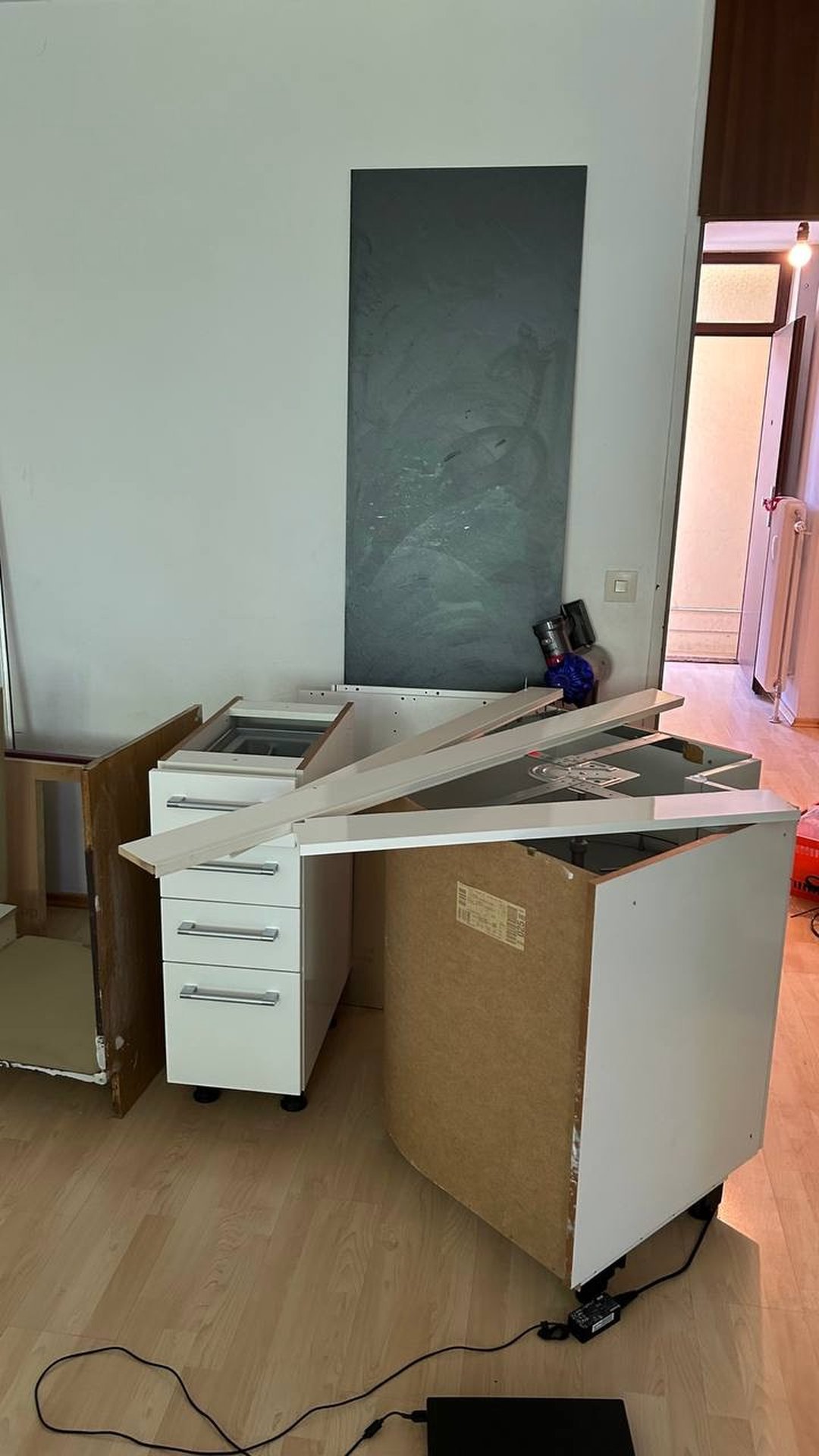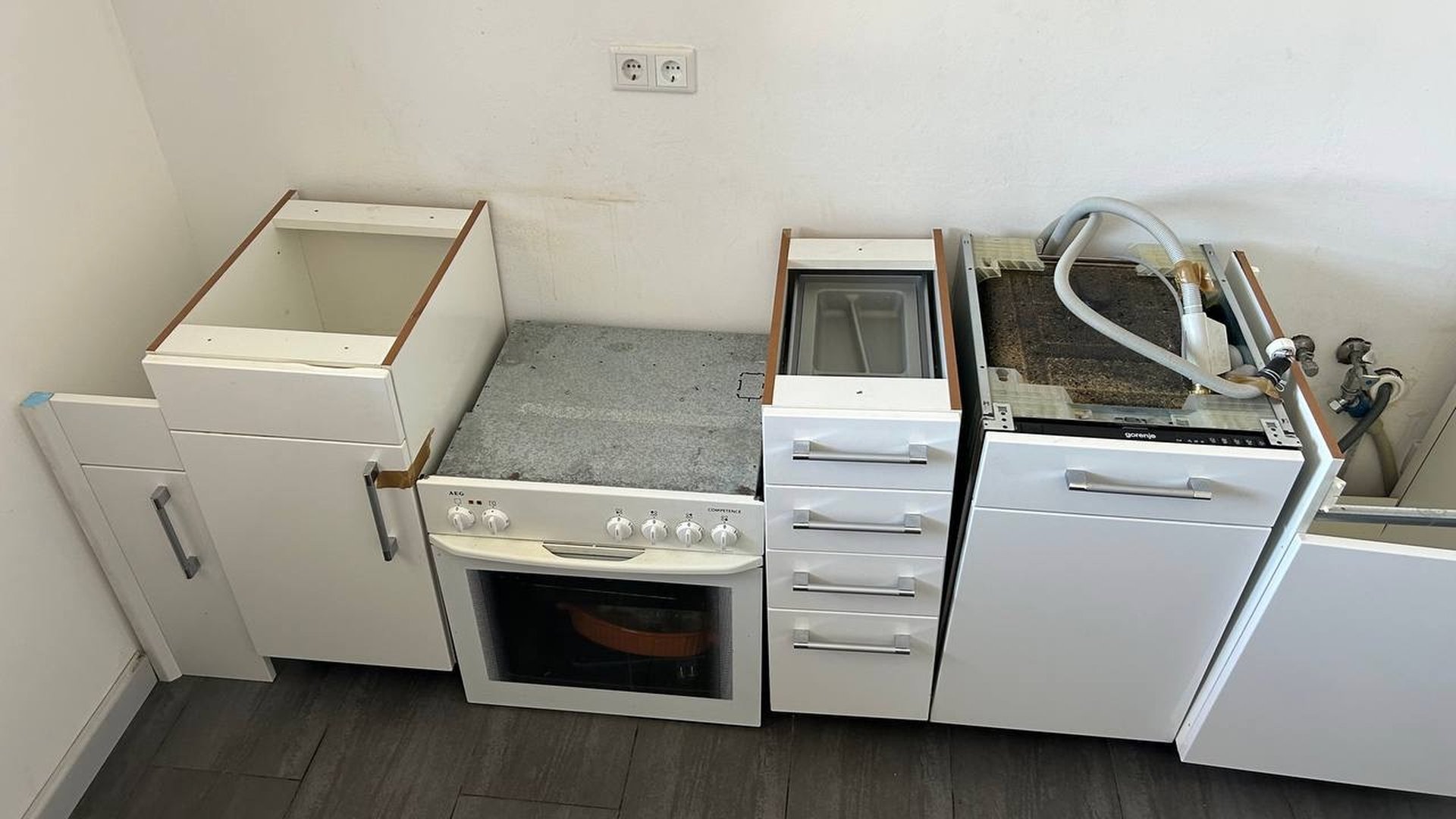 Zusammenbau einer Küche aus zwei gebrauchten Küchen, Umbau von zwei Unter- und zwei Oberschränken mit Fronten, Austausch der Arbeitsplatte mit Einbau eines Wanddekorpaneels, Einbau von Steckdosen im Dekorpaneel, Einbau aller Elektrogeräte, Einbau von Spüle und Herd, Austausch des Wasserhahns, Haube der Oberschränke, Haube der Dunstabzugshaube, neuer Sockel