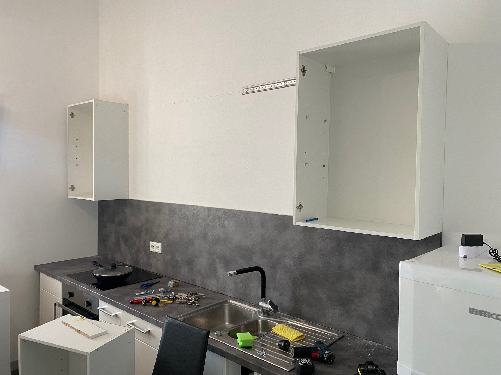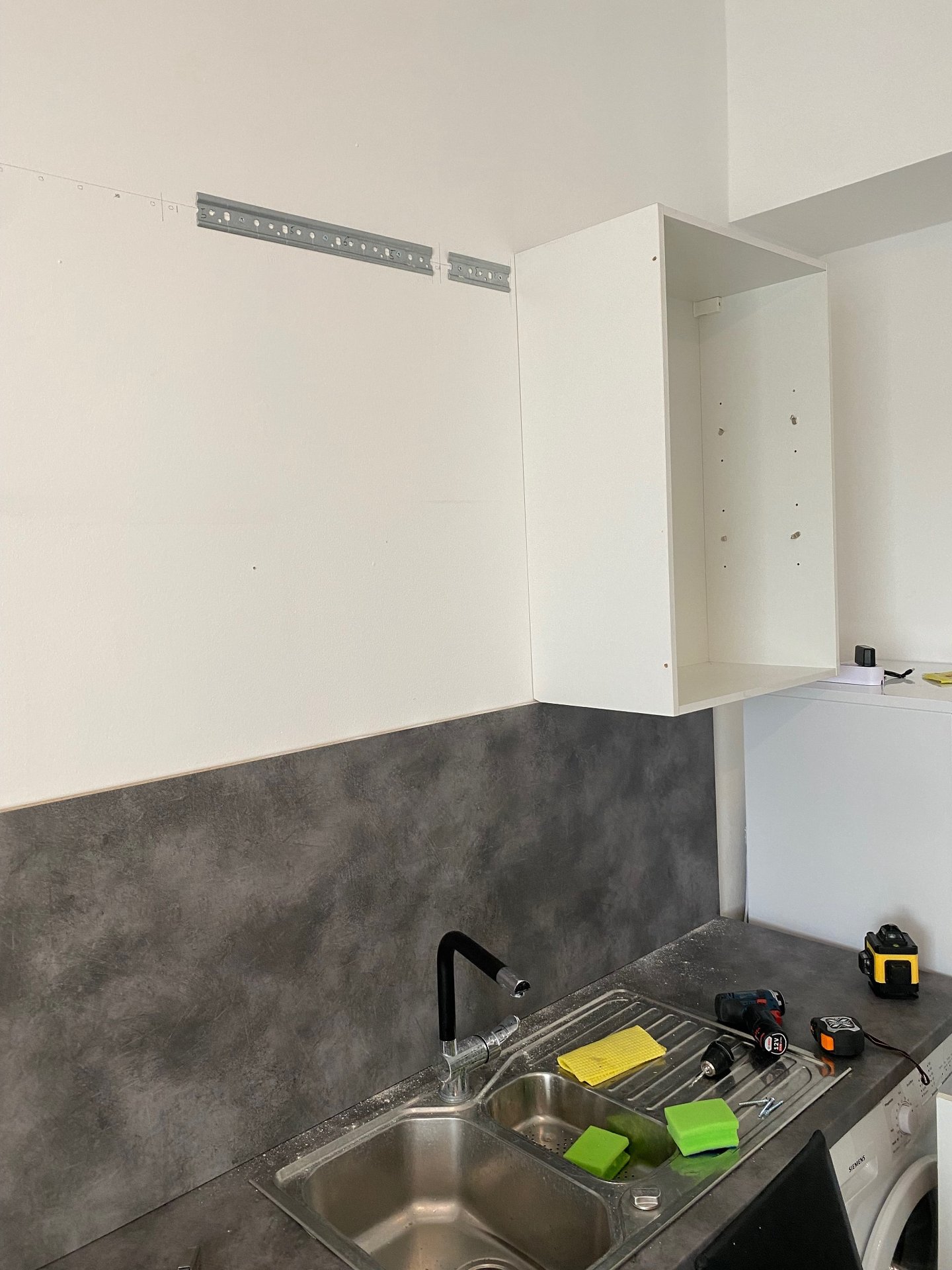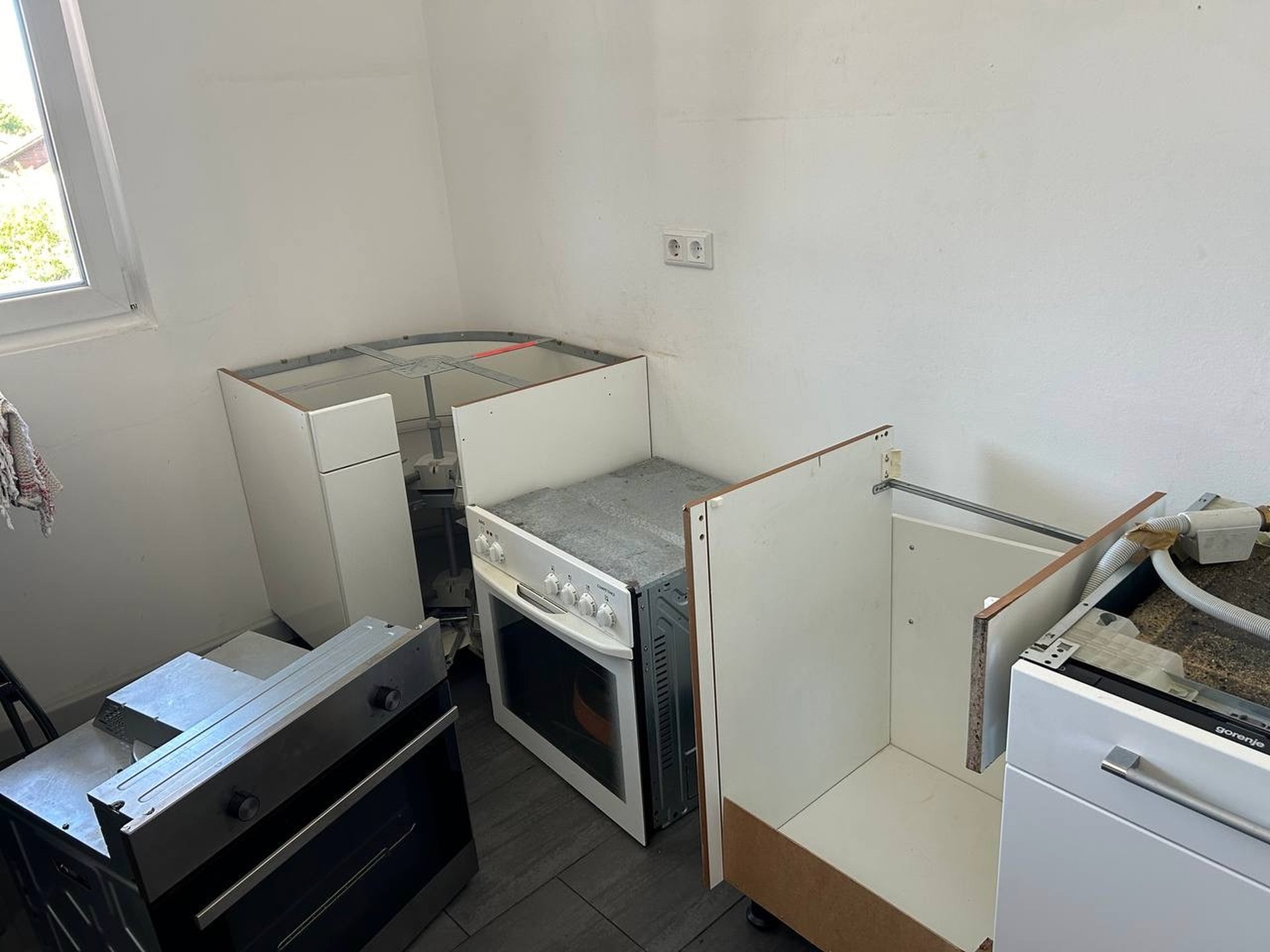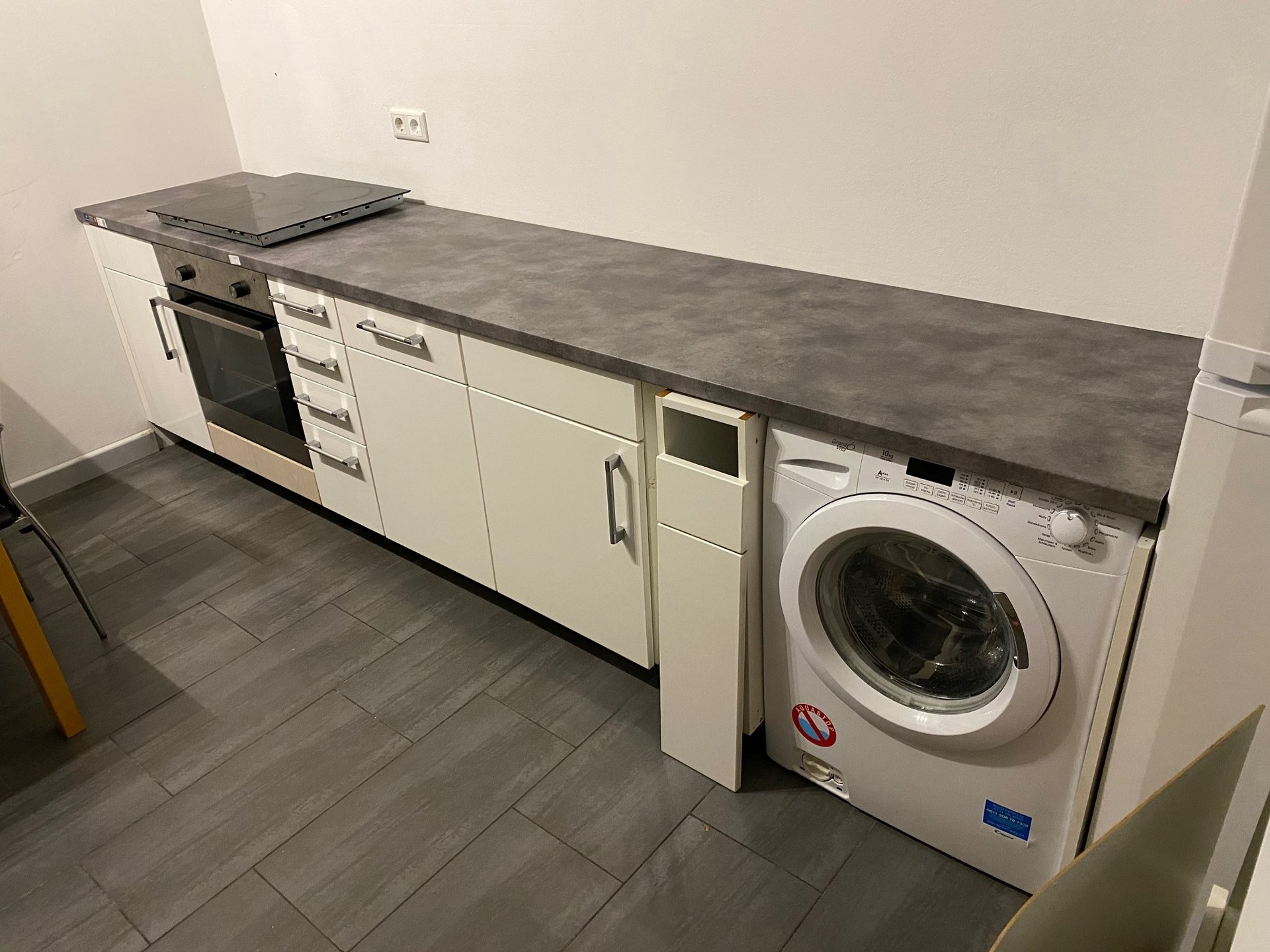 Zusammenbau einer Küche aus zwei gebrauchten Küchen, Umbau von zwei Unter- und zwei Oberschränken mit Fronten, Austausch der Arbeitsplatte mit Einbau eines Wanddekorpaneels, Einbau von Steckdosen im Dekorpaneel, Einbau aller Elektrogeräte, Einbau von Spüle und Herd, Austausch des Wasserhahns, Haube der Oberschränke, Haube der Dunstabzugshaube, neuer Sockel