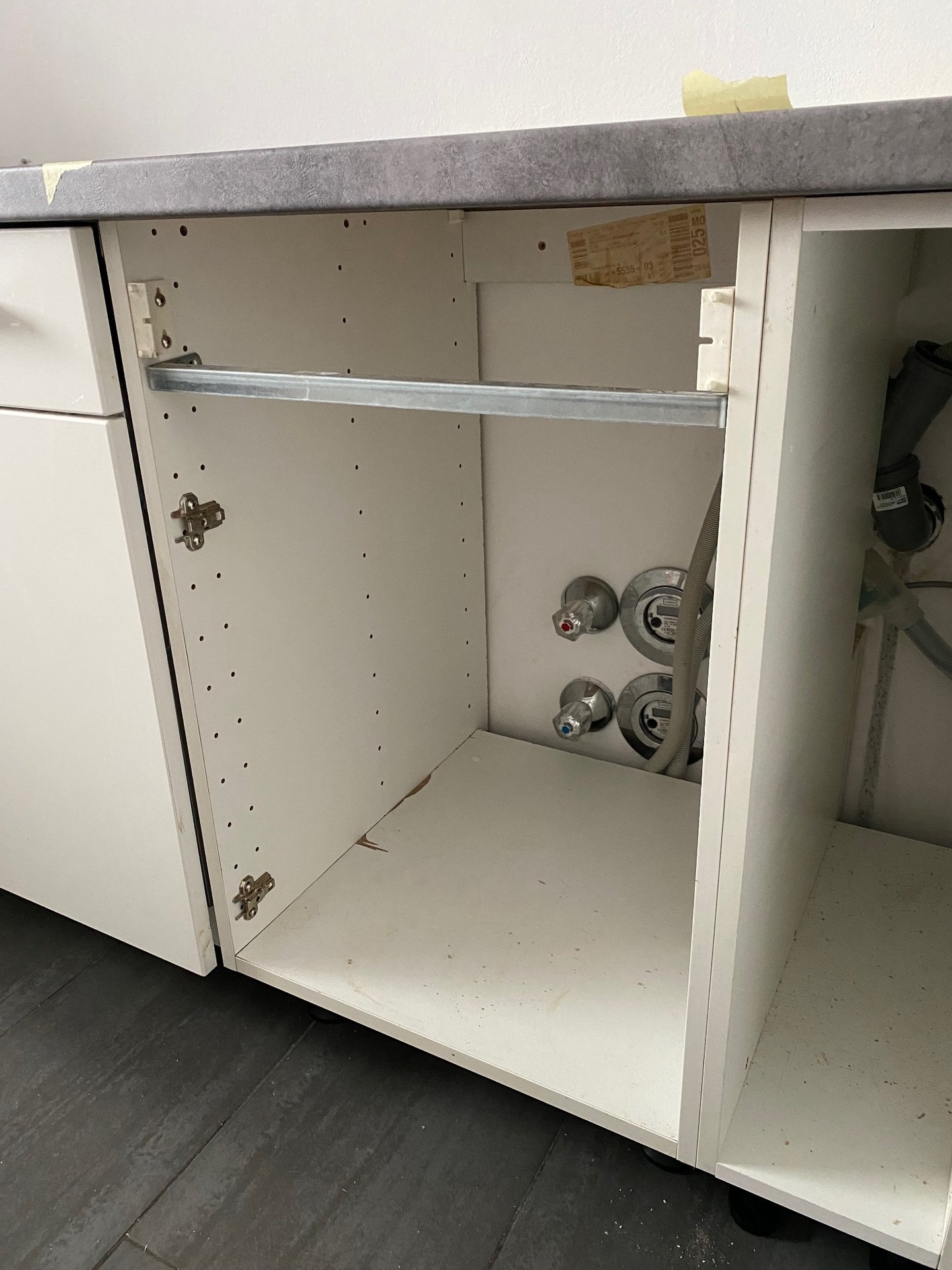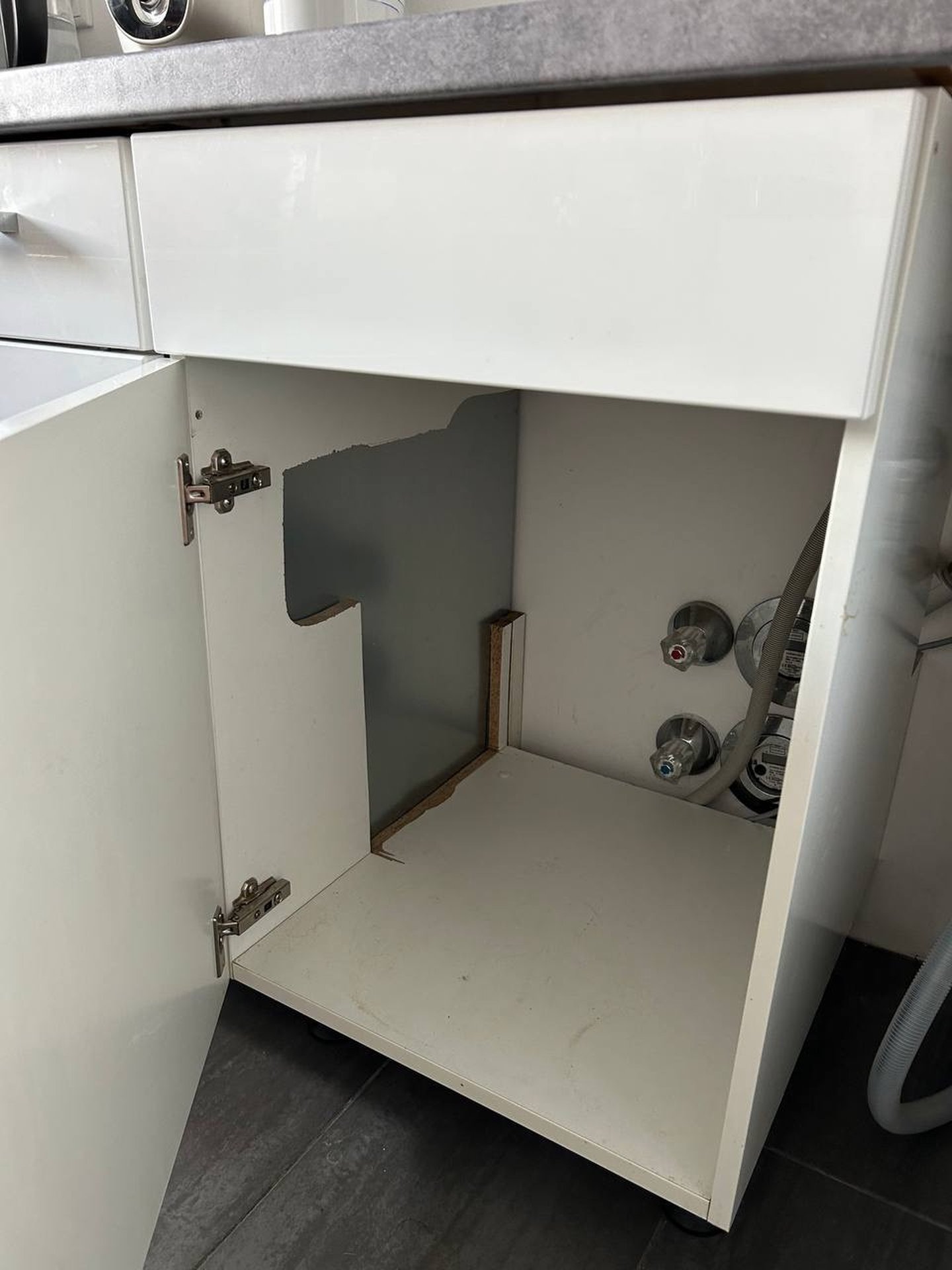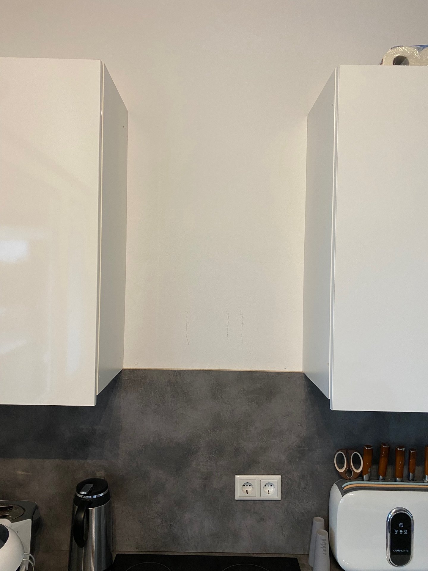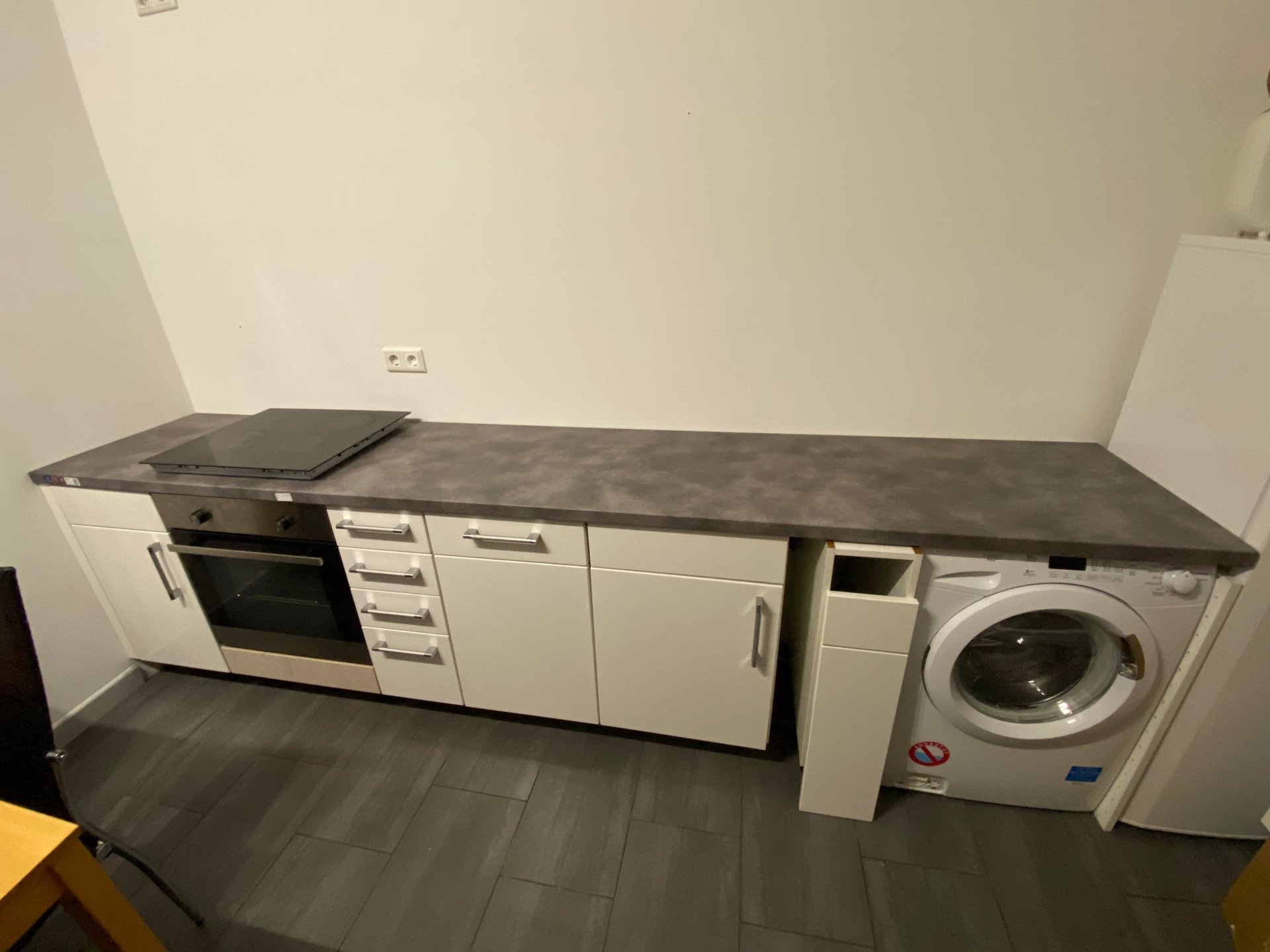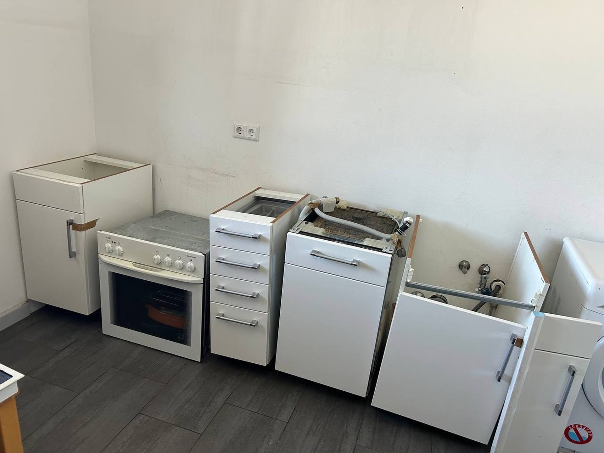 Zusammenbau einer Küche aus zwei gebrauchten Küchen, Umbau von zwei Unter- und zwei Oberschränken mit Fronten, Austausch der Arbeitsplatte mit Einbau eines Wanddekorpaneels, Einbau von Steckdosen im Dekorpaneel, Einbau aller Elektrogeräte, Einbau von Spüle und Herd, Austausch des Wasserhahns, Haube der Oberschränke, Haube der Dunstabzugshaube, neuer Sockel