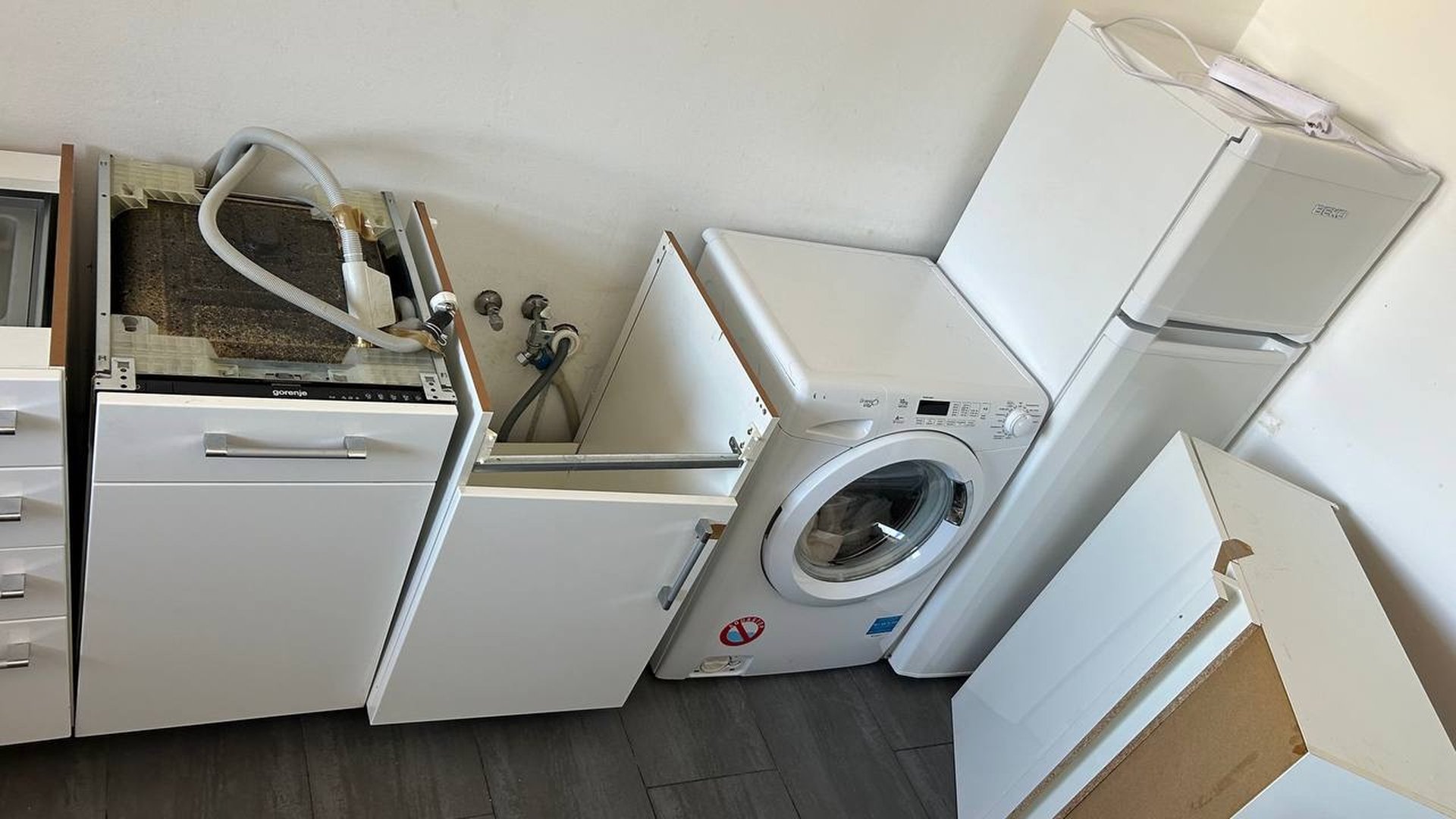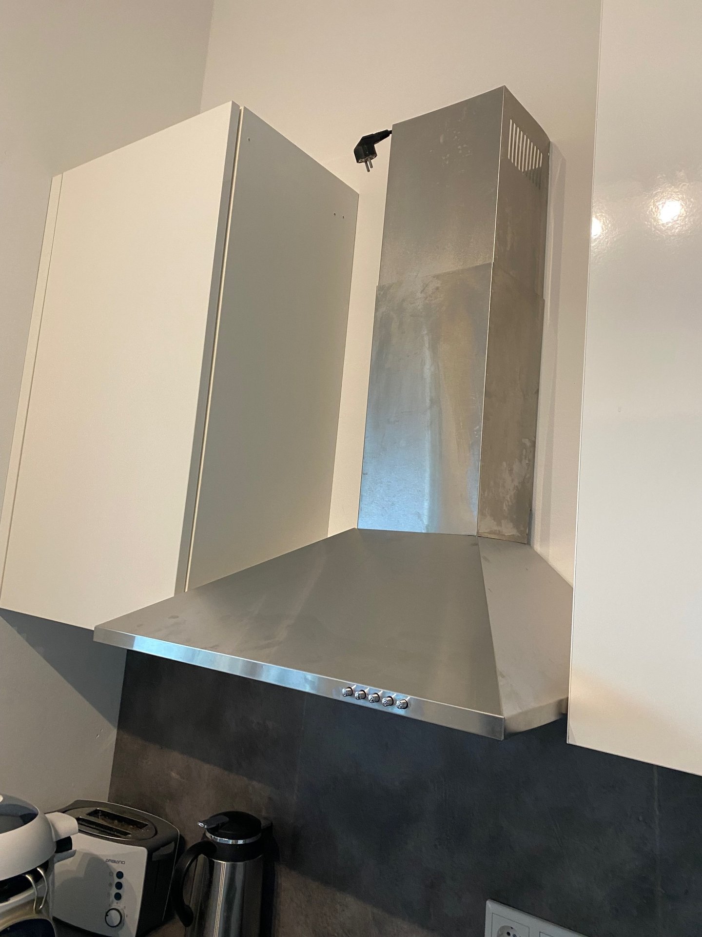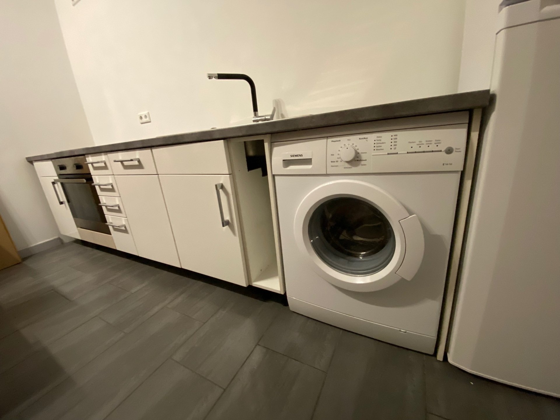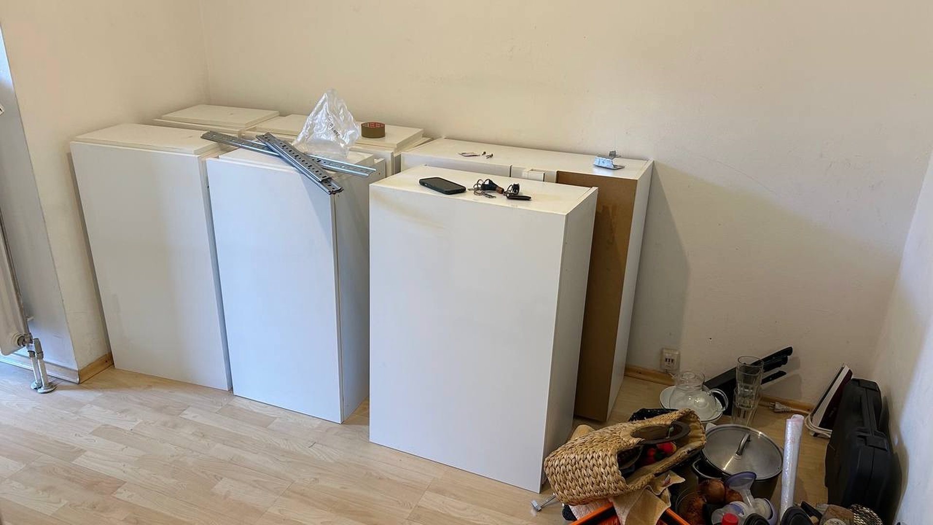 Zusammenbau einer Küche aus zwei gebrauchten Küchen, Umbau von zwei Unter- und zwei Oberschränken mit Fronten, Austausch der Arbeitsplatte mit Einbau eines Wanddekorpaneels, Einbau von Steckdosen im Dekorpaneel, Einbau aller Elektrogeräte, Einbau von Spüle und Herd, Austausch des Wasserhahns, Haube der Oberschränke, Haube der Dunstabzugshaube, neuer Sockel